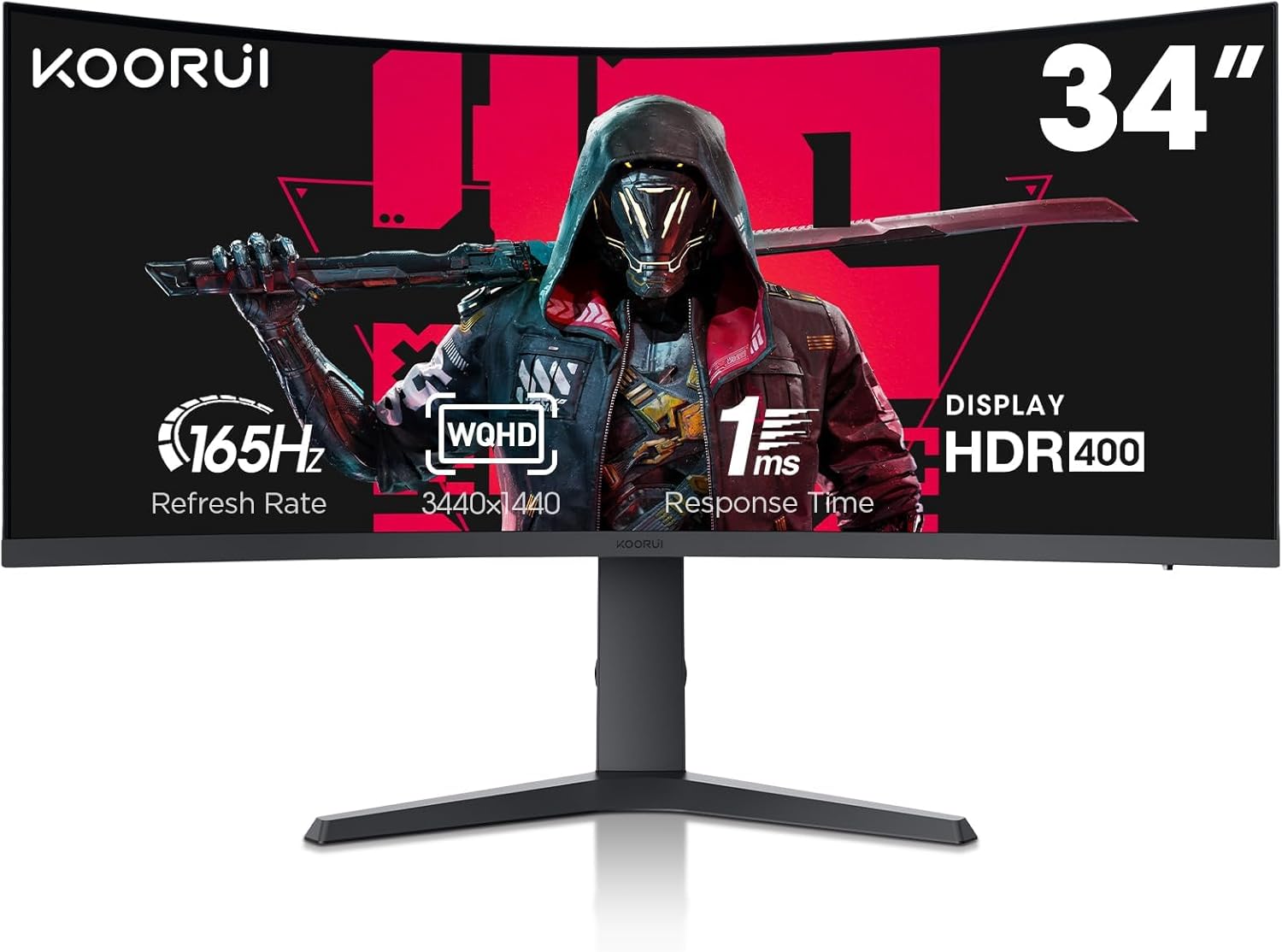 KOORUI 34 Inch Ultrawide Curved Gaming Monitor 165HZ, 1ms, 1000R, WQHD 3440 * 1440, 21:9, DCI-P3 90% Color Gamut, Adaptive Sync Compatible, Tilt/Height Adjustable Stand, HDMI, Display Port, Black